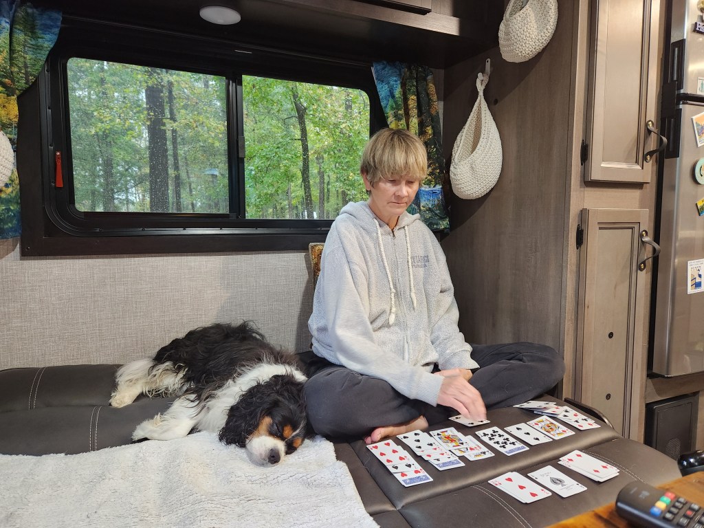 I enjoy listening to the rain, it’s very relaxing. When Buddy was a puppy we were in the U.P. tent camping, with thunderstorms and cold weather. He had to sleep between Carol and myself to stay warm. Now we are in a warm dry trailer with everything we need. Interesting how things change. Even with all the problems we have had with our trailer, it was a good move.