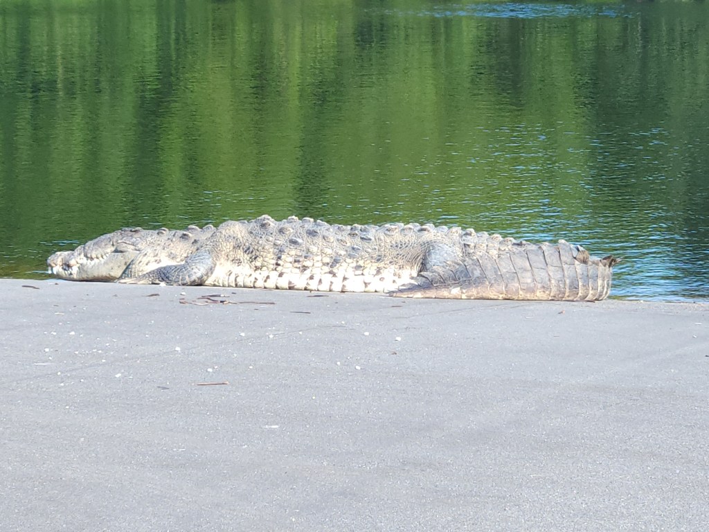 A crocodile sunning himself at the Flamingo marina. He ownes the boat ramp!