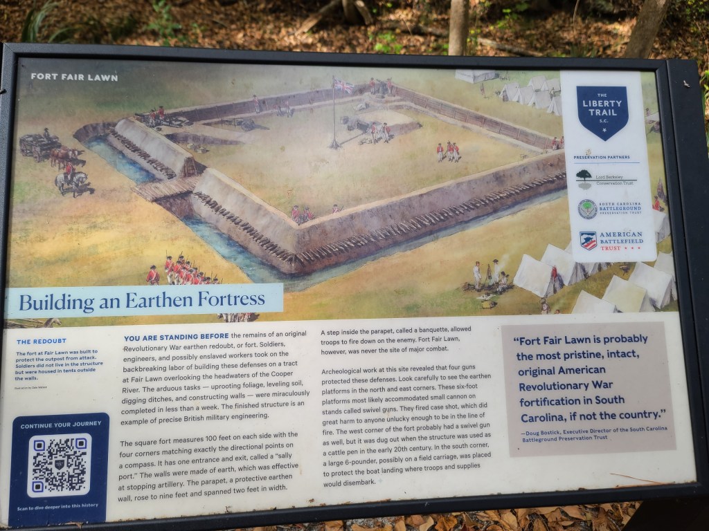 The park is also the site of Fort Fair Lawn. The fort was used during the American Revolution. The British manned the fort until 1781, when they retreated to Charles Town, currently known as Charleston.