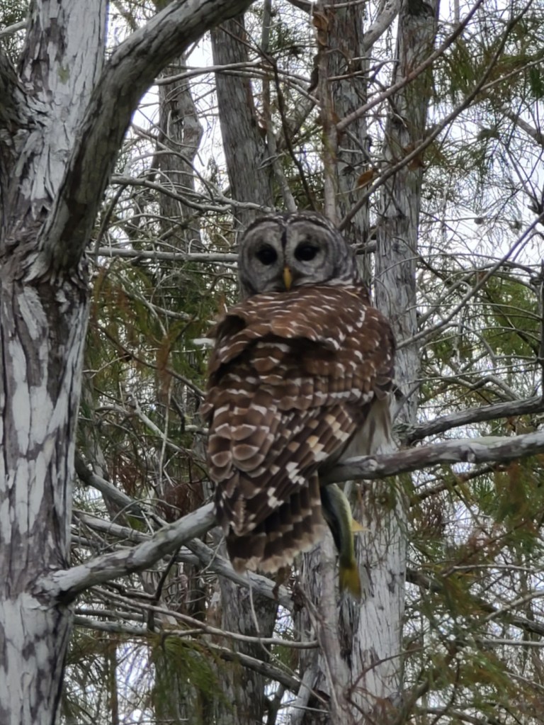 We went out exploring the area today and watched a Barred owl take a fish from a Great Egret and then fly up to a branch in a tree. Carol was able to take a great picture of the owl.