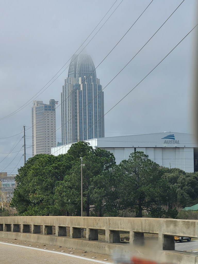 Short day on the road, is was the windiest day we’ve had and the truck was hard to control on the causeways, it rained and there was still a layer of fog hovering over Mobile AL. Seems like a typical day for us any more.