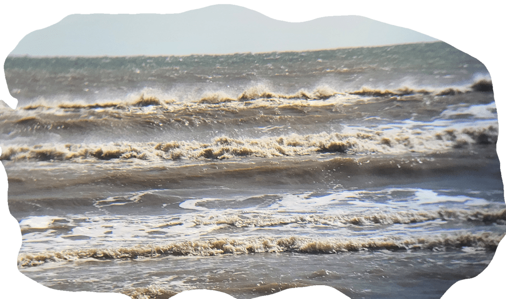 The waves are high, six feet or more beyond the beach.