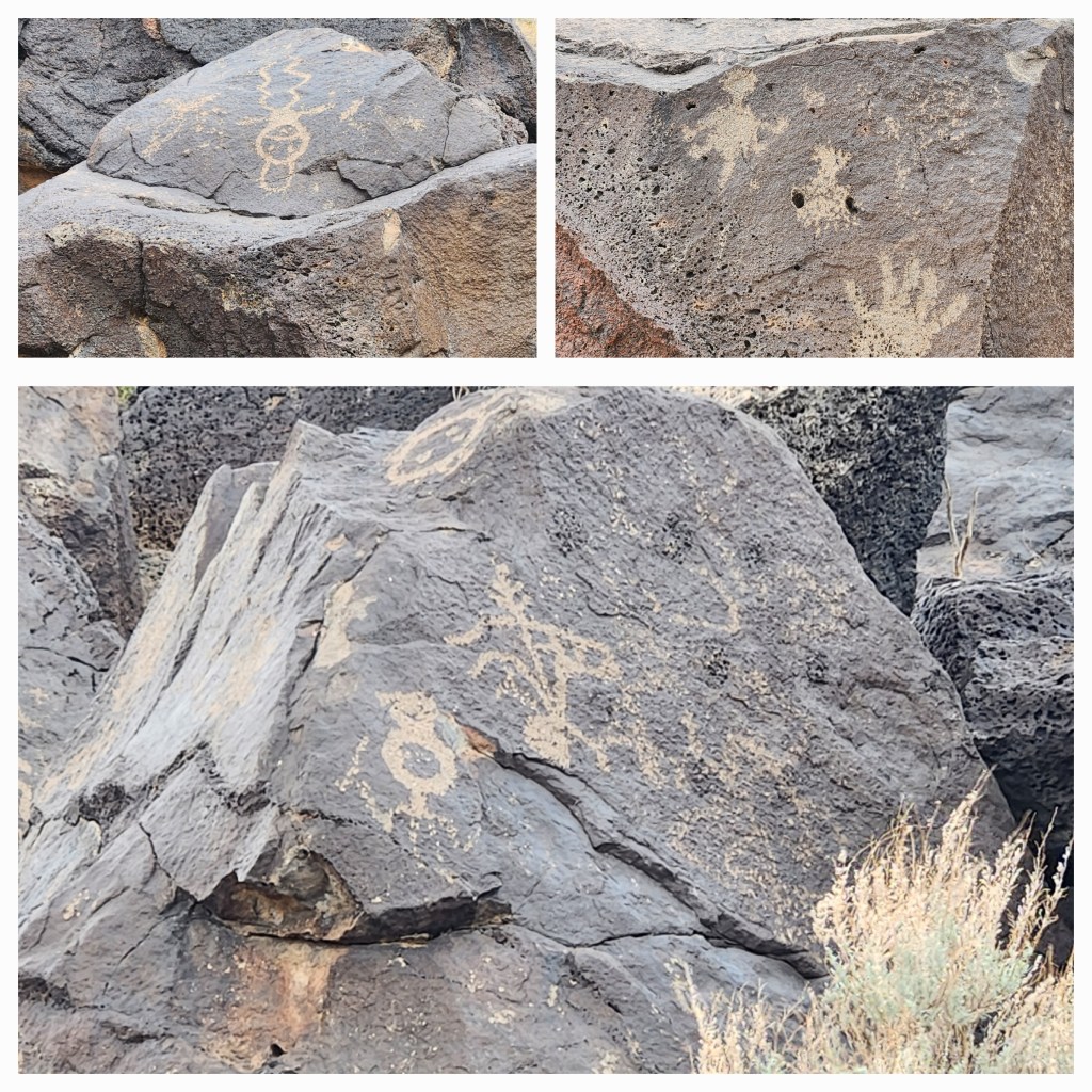 We canceled the trip to Santa Fe NM and decided to go to Petroglyph National Monument. The sites are at different areas around the city so we went to the visitors center for information and maps. They told us about a site that was only a few miles away and had short trails that we could probably do before the storm came in. We drove to the site and started our hike on the sandy trail with the wind in our face. We already had fifteen mph winds out of the southwest with some sand and rain mixed in.
