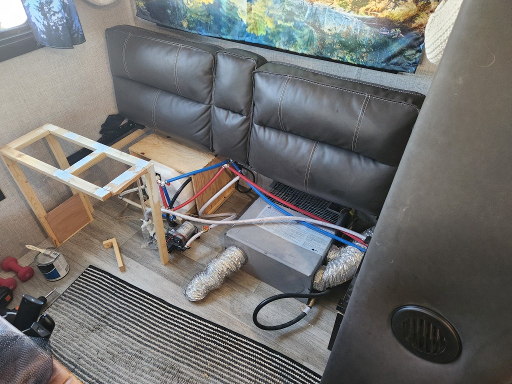 I know, they look the same. That’s because I actually made changes to area where the heater is under the couch and raised the couch about an inch. I wanted to filter the air going in the heater instead of blowing dirt through the trailer and it wasn’t designed for that. Our trailer is poorly insulated so the heater and air conditioner run more then they should have to. The air conditioner can’t keep up on a day like today. We have windows open and fans running. What’s a little more dust.