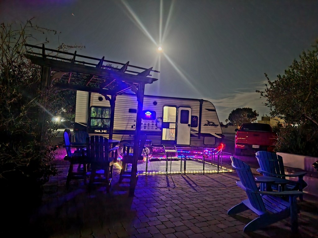 A full moon casting its light over our trailer, our sanctuary, creating a beautiful and picturesque scene, evoking a sense of tranquility and romance with a touch of intrigue.